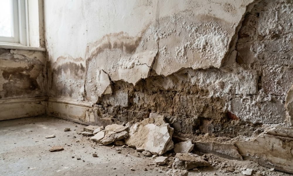 Ako vidite masne, stalno mokre fleke, zid se osipa, kruni ili gubi čvrstinu – to više nije kondenz. To može biti prodorna vlaga spolja ili kapilarna vlaga iz konstrukcije.
